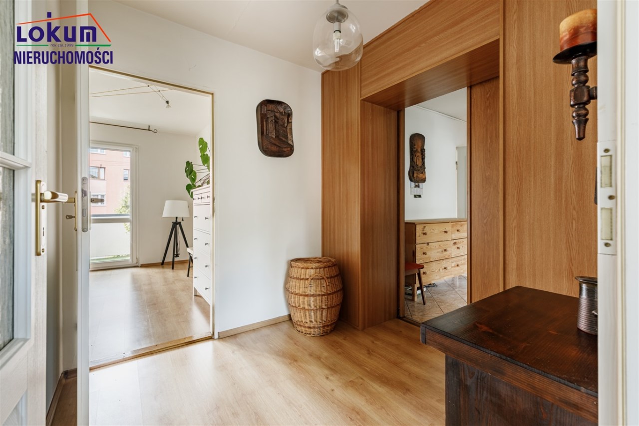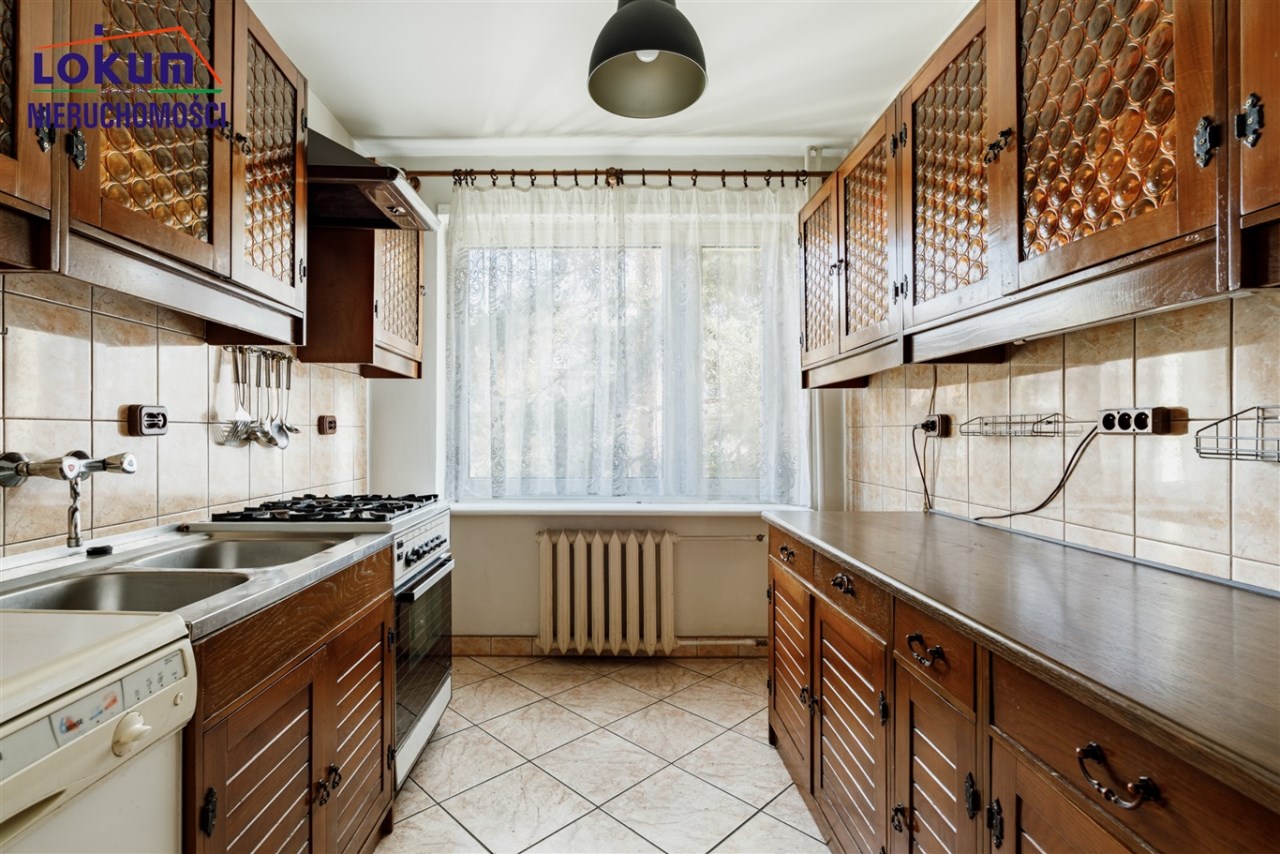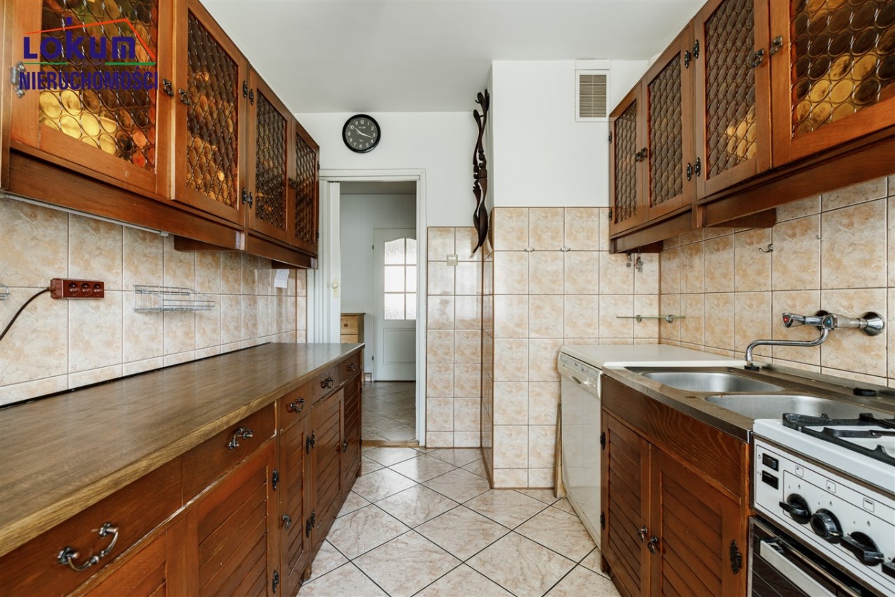 - osobnej, jasnej kuchni z oknem (wschód) – z zabudową meblową w starszym, ale solidnym stylu. Pomieszczenie jest na tyle ustawne, że można w nim zaplanować zmianę aranżacji,